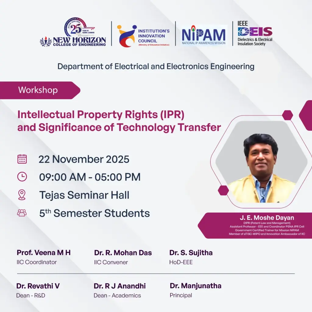 SEMINARS & WORKSHOPS Workshop on Intellectual Property Rights (IPR) and Significance of Technology Transfer Department: Electrical and Electronics EngineeringDate: 22 November 2025Time: 9:00 AM to 5:00 PM The Department of Electrical and Electronics Engineering organized a one-day workshop on “Intellectual Property Rights (IPR) and Significance of Technology Transfer” on 22nd November 2025. The event was […]
