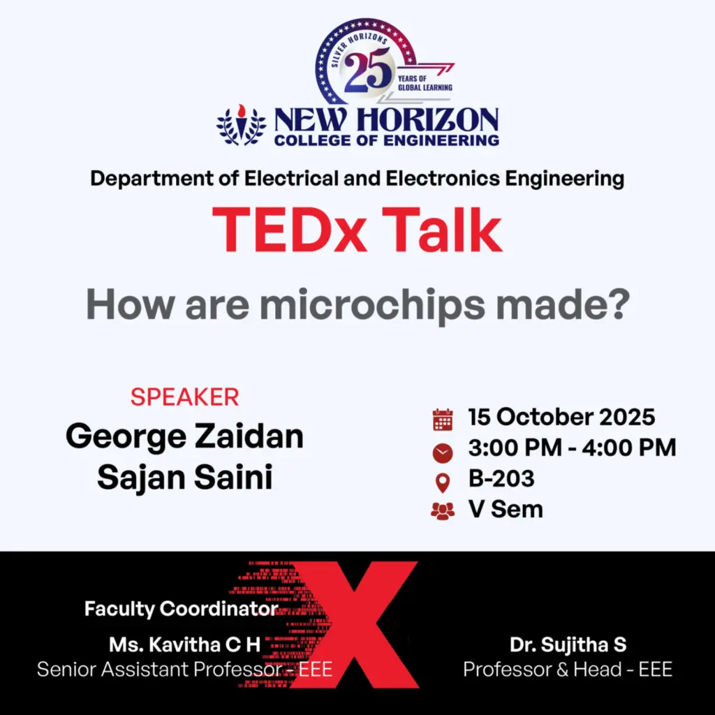 SEMINARS & WORKSHOPS TEDx Talk – How Are Microchips Made Organized by: Department of Electrical and Electronics Engineering, New Horizon College of Engineering, BengaluruDate: 15th October, 2025Time: 03:00PM-04:00 PM On 15th October 2025, the Department of Electrical and Electronics Engineering at New Horizon College of Engineering hosted a TEDx Talk titled “How Are Microchips Made?” in Room […]
