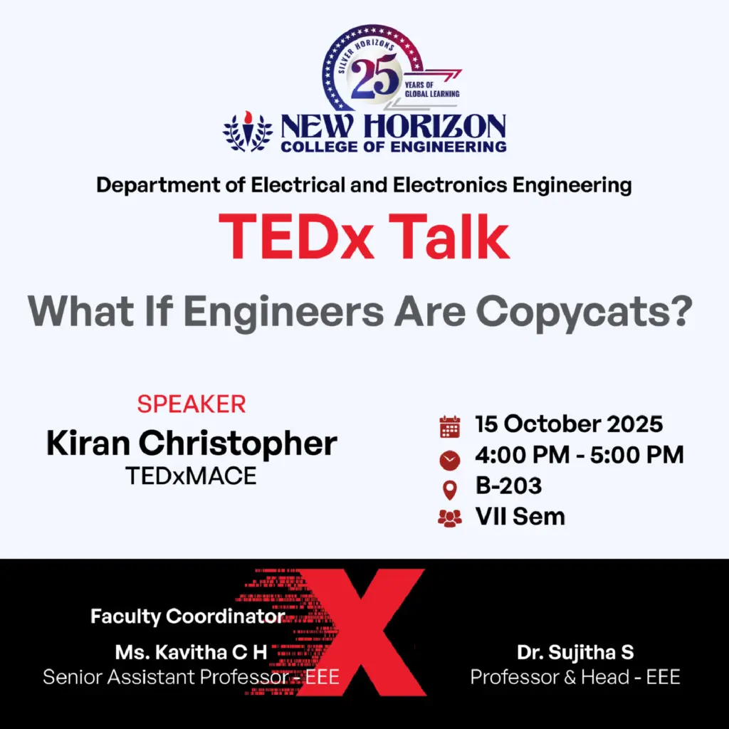 SEMINARS & WORKSHOPS TEDx Talk -What If Engineers Are Copycats Organized by: Department of Electrical and Electronics Engineering, New Horizon College of Engineering, BengaluruDate: 15th October, 2025Time: 04:00PM-05:00 PM On 15th October 2025, the Department of Electrical and Electronics Engineering hosted a TEDx Talk titled “What If Engineers Are Copycats?” as part of its academic enrichment initiatives. […]