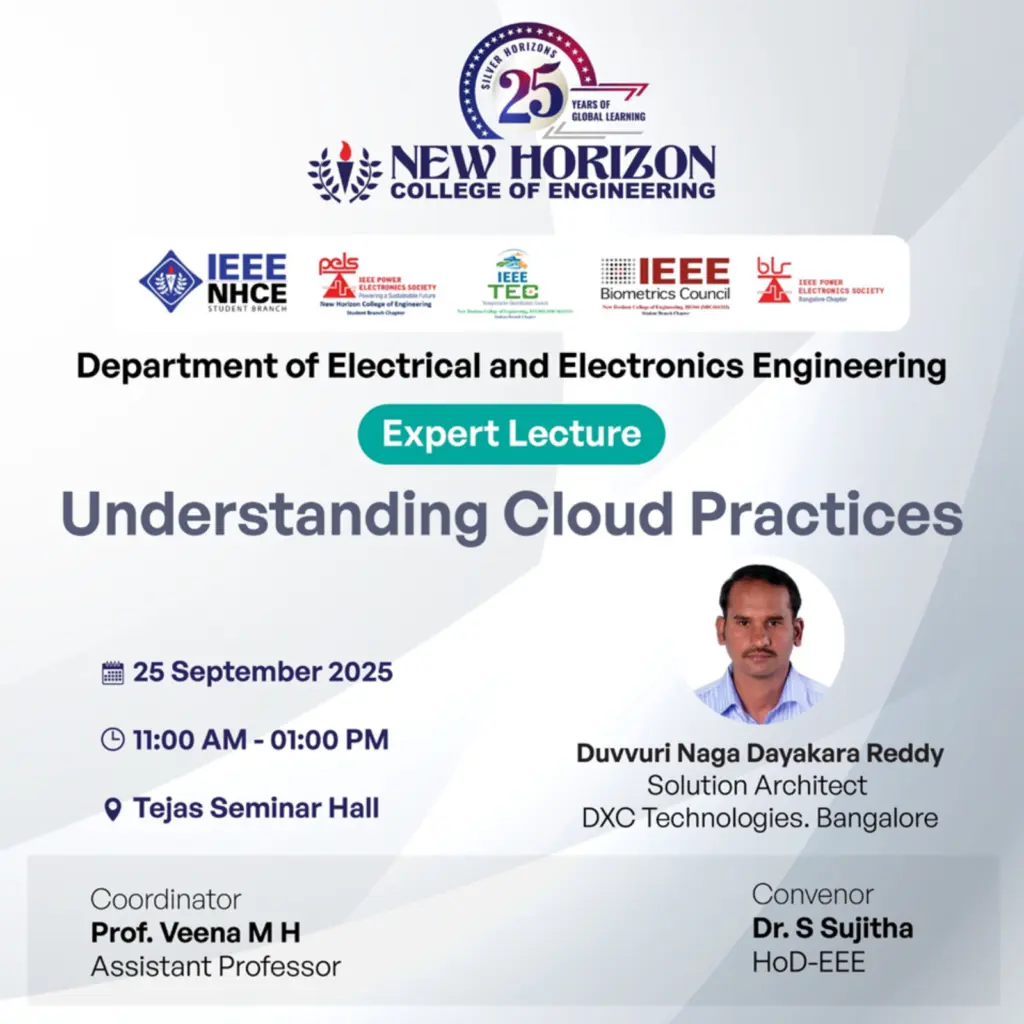 SEMINARS & WORKSHOPS Expert Lecture on Understanding Cloud Practices Organized by: Department of Electrical and Electronics Engineering, New Horizon College of Engineering, BengaluruDate: 25th September, 2025Time: 11:00 AM to 01:00 PM The Department of Electrical and Electronics Engineering, in collaboration with the IEEE NHCE Student Branch, IEEE Power Electronics Society NHCE SBC, IEEE Biometrics Council, […]