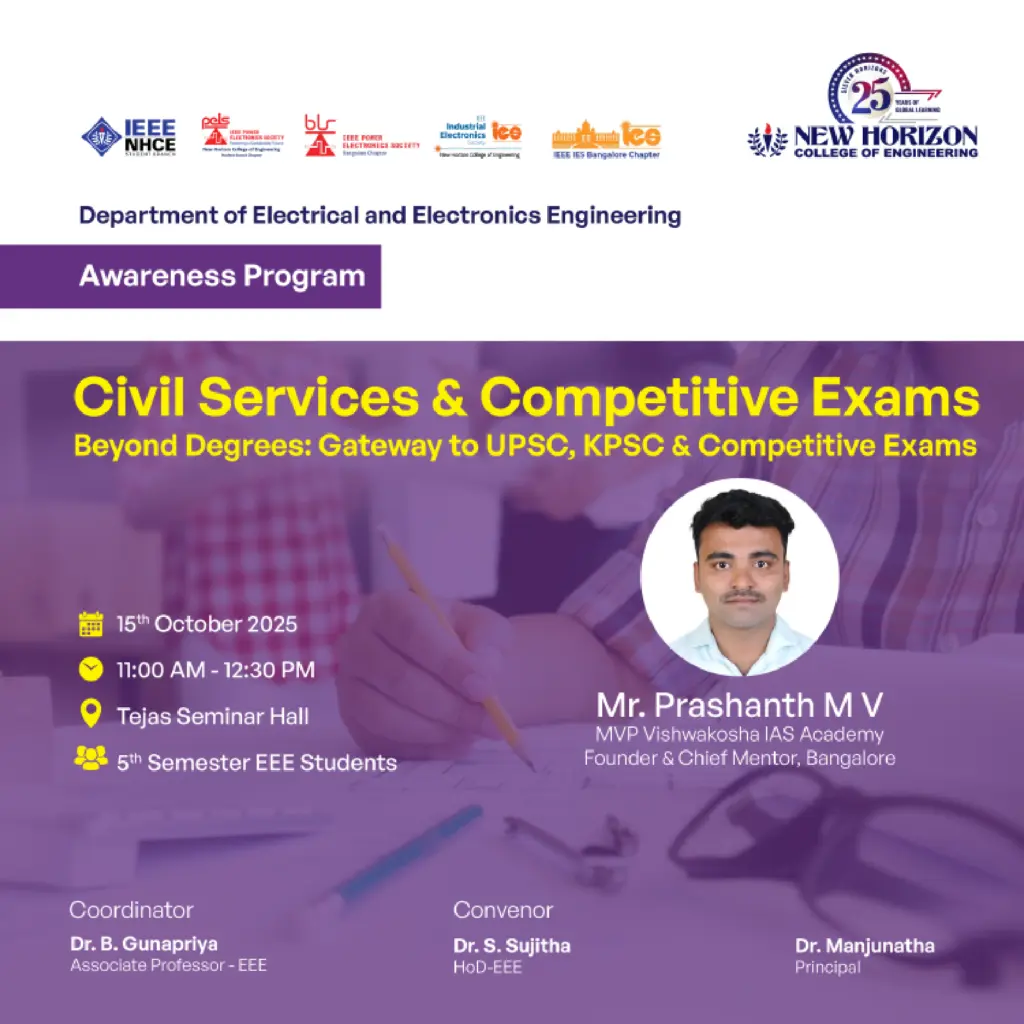 SEMINARS & WORKSHOPS Civil Services and Competitive Exams – Beyond Degrees: Gateway to UPSC, KPSC & Competitive Exams Organized by: Department of Electrical and Electronics Engineering, New Horizon College of Engineering, BengaluruDate: 15th October, 2025 The Department of Electrical and Electronics Engineering at New Horizon College of Engineering organized an awareness session titled“Civil Services & […]