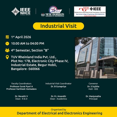 CO-CURRICULAR ACTIVITIES Industrial Visit-TUV Rheinland India Pvt. Ltd The Department of Electrical and Electronics Engineering (EEE), in association with the IEEE NHCE Student Branch and IEEE DEIS Student Branch Chapter, organised an industrial visit for 4th Semester EEE students of Section B on 1st April 2026. The visit was conducted at TUV Rheinland India Pvt. […]
