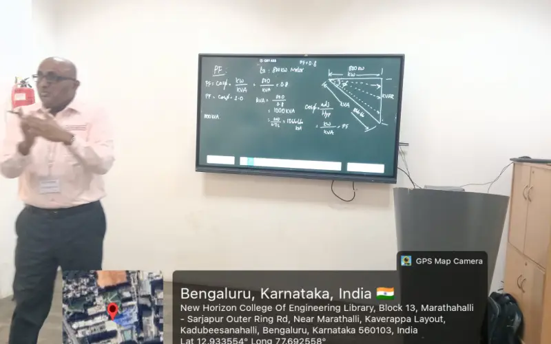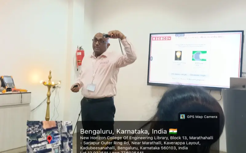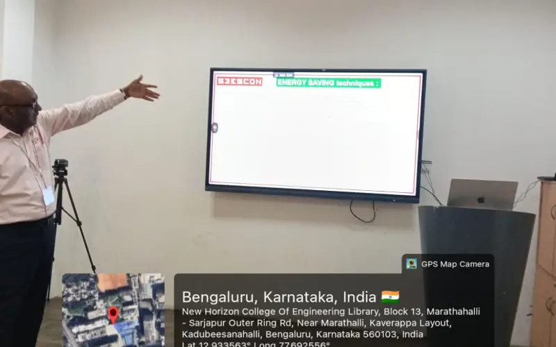 The Department of Electrical and Electronics Engineering at New Horizon College of Engineering, Bengaluru, organized a guest lecture titled “Energy Saving Auditing for a Sustainable Future Environment” on 23rd April 2026 for 6th semester students. The session was delivered by Mr. Arunakumara T S, MD & CEO of SEESCON, Bengaluru, and was held at the Library Video Conference Hall from 2:30 PM to 4:30 PM.
